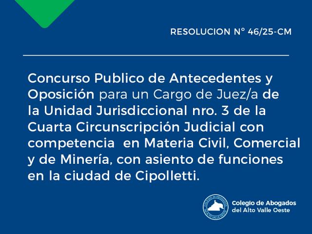Concurso Publico de Antecedentes y Oposición para un Cargo de Juez/a de la Unidad Jurisdiccional nro. 3 de la Cuarta Circunscripción Judicial con competencia en Materia Civil, Comercial y de Minería, con asiento de funciones en la ciudad de Ci..