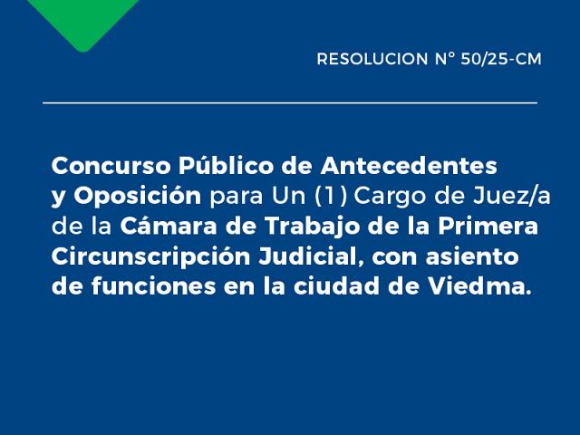 Concurso Publico de Antecedentes y Oposición: un (1) Cargo de Juez/a de la Cámara de Trabajo de la Primera Circunscripción Judicial, con asiento de funciones en la ciudad de Viedma. ..