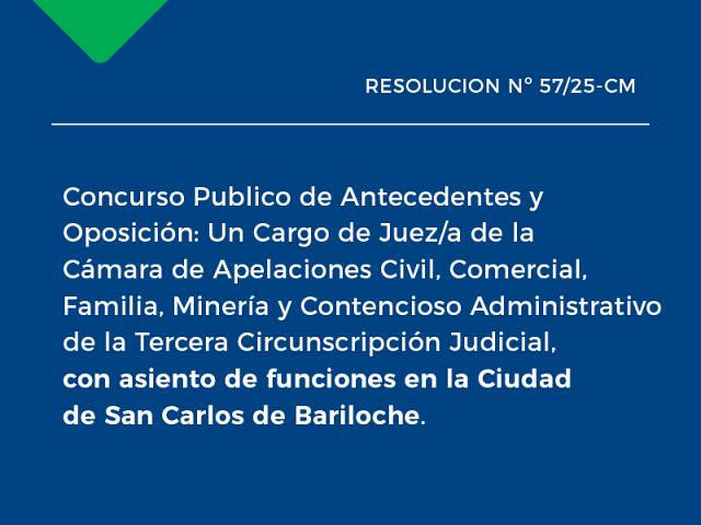 Un (1) Cargo de Juez/a de la Cámara de Apelaciones Civil, Comercial, Familia, Minería y Contencioso Administrativo de la Tercera Circunscripción Judicial, con asiento de funciones en la Ciudad de San Carlos de Bariloche. ..
