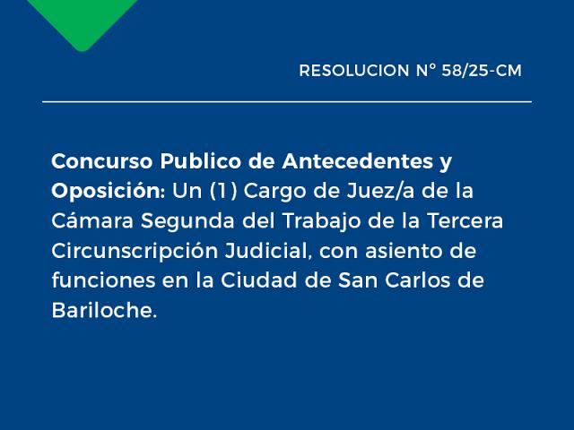 Un (1) Cargo de Juez/a de la Cámara Segunda del Trabajo de la Tercera Circunscripción Judicial, con asiento de funciones en la Ciudad de San Carlos de Bariloche..
