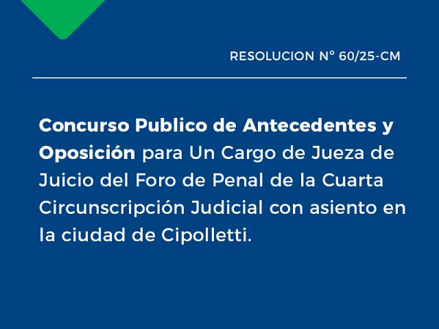 Concurso Publico de Antecedentes y Oposición para Un Cargo de Jueza de Juicio del Foro de Penal de la Cuarta Circunscripción Judicial con asiento en la ciudad de Cipolletti. ..