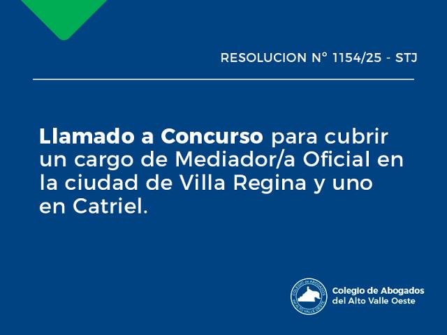 Resolución 1154/25 - Pcia. STJ - Llamado a Concurso para cubrir un cargo de Mediador/a Oficial en la ciudad de Villa Regina y uno en Catriel3 ..