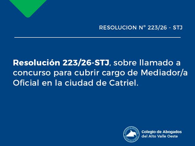Resolución 223/26-Pcia.STJ sobre llamado a concurso para cubrir cargo de Mediador/a Oficial en la ciudad de Catriel. ..
