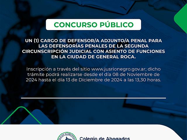 Concurso Público de Antecedentes y Oposición Concurso: Un Cargo de Defensor/a Adjunto/a para las Defensorías Penales de la Segunda Circunscripción Judicial con asiento de funciones en la ciudad de General Roca Inscripción vía electrónica a trav&eacu..