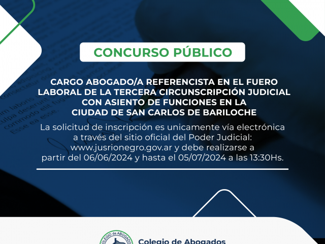 Concurso Público de Antecedentes y Oposición del Poder Judicial de la Provincia de Rio Negro.Un (1) cargo Abogado/a Referencista en el Fuero Laboral de la Tercera Circunscripción Judicial con asiento de funciones en la ciudad de San Carlos de Bariloche.La solicitud de inscripci&..